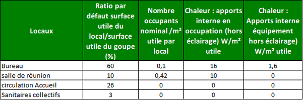 Explication concernant le ratio de surface utile d'un local La RT2012 définit pour chaque usage, la proportion par défaut de surface accordée à chaque activité. Ceci entraîne de lourdes conséquences. Par exemple, une zone d'usage bureau présente les différentes données conventionnelles d'occupation suivantes (valeurs extraites de la Méthode ThBCE) : Pour une zone bureau de 100 m2 nous avons par défaut 60 m2 d'activité bureau + 10 m2 de salle de réunion + 26 m2 de circulation + 3 m2 de sanitaire. En laissant ces valeurs par défaut, votre zone bureau aura des apports de chaleur qui ne seront pas nécessairement représentatifs de votre ouvrage. Cela peut s'avérer désavantageux.