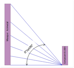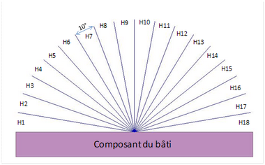 Il existe deux façons de décrire un masque lointain en RT2012, par placement d'un masque vertical à une distance de l'élément ou par angle azimutal. Masque lointain vertical Le masque lointain vertical n'est pas utilisé par DesignBuilder car il ne permet pas de forme sophistiquée et son appréciation est trop flou car elle est relative à chaque élément du bati (mur, fenêtre, pont thermique). Masque azimutal La description par azimut d'un masque implique de découper l'angle de vue depuis l'élément du bâti (fenêtre, paroi) en 18 tranches de 10°C. Pour chacune de ces tranches la hauteur en angle permet de définir le masque. Ce système est systématiquement utilisé dans DesignBuilder pour les masques lointains car il offre plus de liberté de dessin et possède aussi la propriété d'être végétalisé c'est à dire d'avoir ou non un feuillage.