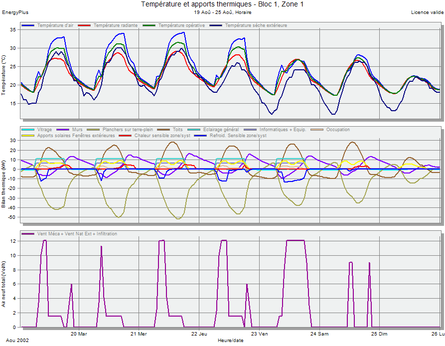 En cours de journée, dès que la t° int dépasse 25°, la ventil retombe au minimum (1,5 vol/h ici) et reprend le soir dès qu'il y a un opportunité (mais seulement si t° int <= 25°).