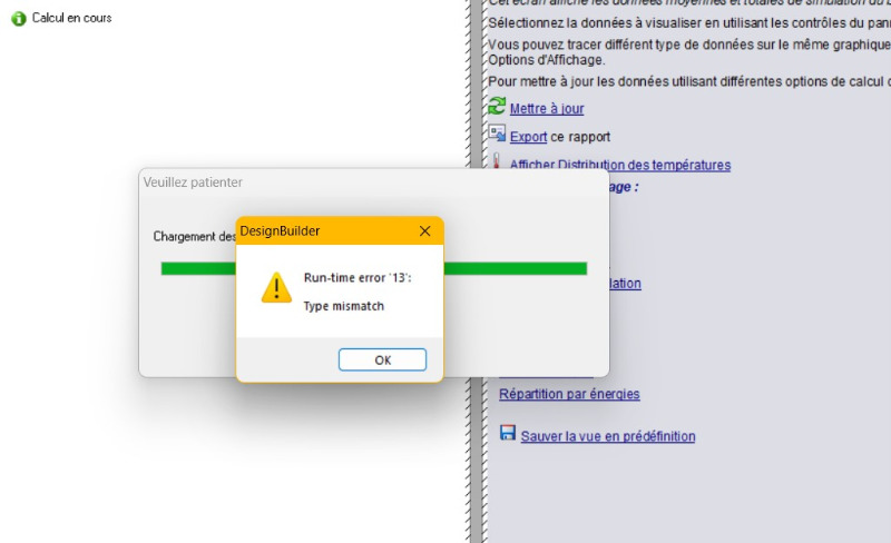 Pas évident de savoir ce qui cloche. Pouvez-vous me transmettre par mail ou message privé du forum votre fichier dsb et diagnostics_jj_mm_aaaa_hh_mm.log de la date de plantage qui se situe dans C:\Users\VOTRE LOGIN WINDOWS\AppData\Local\DesignBuilder\Diagnostics.